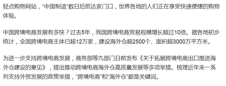 中国跨境电商发展有多快?过去5年,我国跨境电商贸易规模增长超过10倍。据各地初步统计,全国跨境电商主体已超12万家,建设海外仓超2500个、面积超3000万平方米。