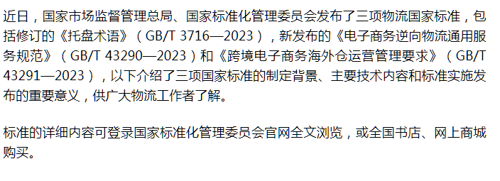 近日,国家市场监督管理总局、国家标准化管理委员会发布了三项物流国家标准,包括修订的《托盘术语》(GB/T 3716—2023),新发布的《电子商务逆向物流通用服务规范》(GB/T 43290—2023)和《跨境电子商务海外仓运营管理要求》(GB/T 43291—2023),以下介绍了三项国家标准的制定背景、主要技术内容和标准实施发布的重要意义,供广大物流工作者了解。