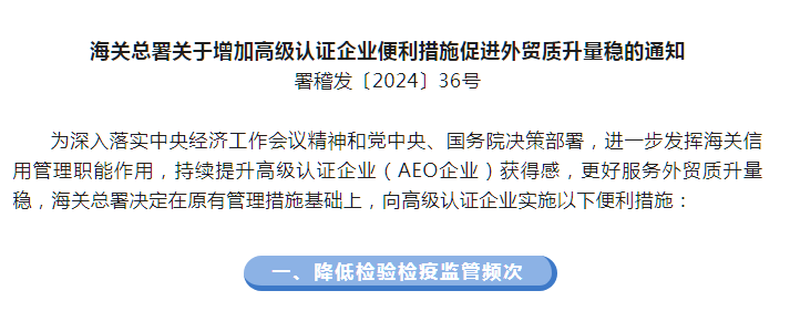 为深入落实中央经济工作会议精神和党中央、国务院决策部署,进一步发挥海关信用管理职能作用,持续提升高级认证企业(AEO企业)获得感,更好服务外贸质升量稳,海关总署决定在原有管理措施基础上,向高级认证企业实施以下便利措施: