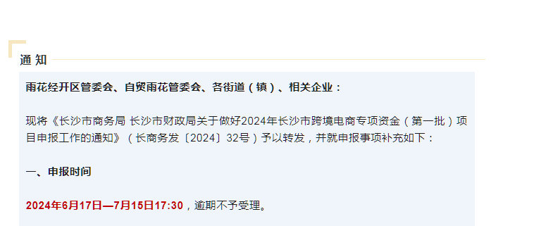 现将《长沙市商务局 长沙市财政局关于做好2024年长沙市跨境电商专项资金(第一批)项目申报工作的通知》(长商务发〔2024〕32号)予以转发,并就申报事项补充如下