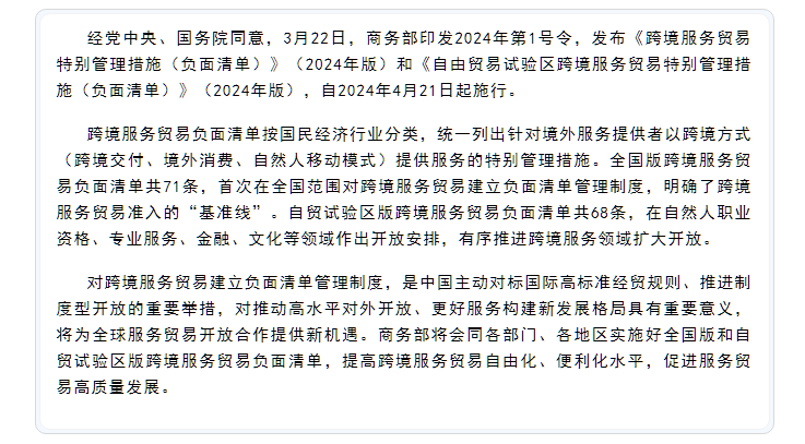经党中央、国务院同意,3月22日,商务部印发2024年第1号令,发布《跨境服务贸易特别管理措施(负面清单)》(2024年版)和《自由贸易试验区跨境服务贸易特别管理措施(负面清单)》(2024年版),自2024年4月21日起施行。