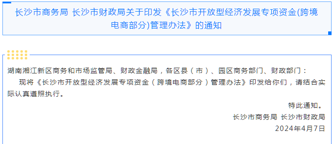 长沙市商务局 长沙市财政局关于印发《长沙市开放型经济发展专项资金(跨境电商部分)管理办法》的通知