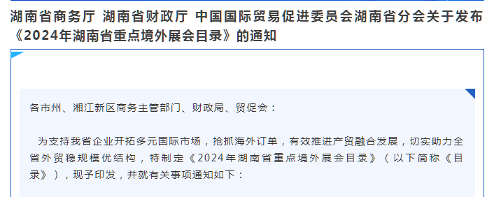 湖南省商务厅 湖南省财政厅 中国国际贸易促进委员会湖南省分会关于发布《2024年湖南省重点境外展会目录》的通知