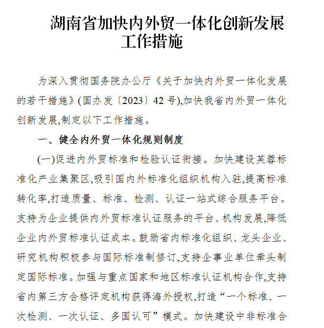 为深入贯彻国务院办公厅《关于加快内外贸一体化发展的若干措施》(国办发〔2023〕42号),加快我省内外贸一体化创新发展,制定以下工作措施。