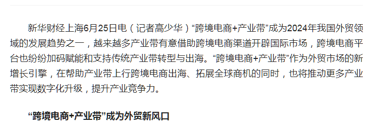 新华财经上海6月25日电(记者高少华)“跨境电商+产业带”成为2024年我国外贸领域的发展趋势之一,越来越多产业带有意借助跨境电商渠道开辟国际市场,跨境电商平台也纷纷加码赋能和支持传统产业带转型与出海。“跨境电商+产业带”作为外贸市场的新增长引擎,在帮助产业带上行跨境电商出海、拓展全球商机的同时,也将推动更多产业带实现数字化升级,提升产业竞争力。